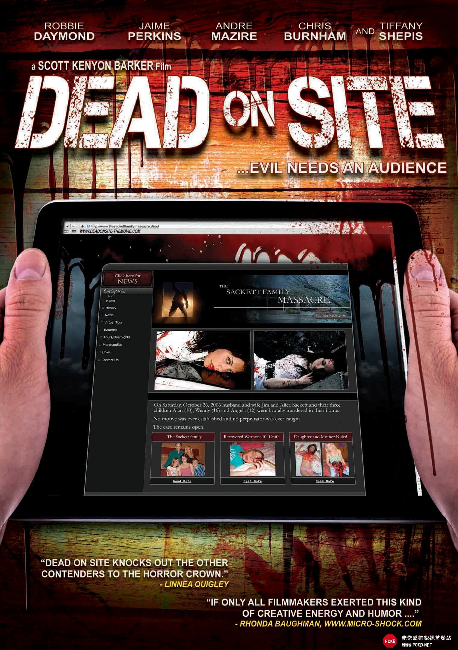 DeadOnSiteisthestoryofagroupofmediaartsmajorswhodecideasafinalprojecttotakeoveravacanthousewhereafamilyhadbeenwipedoutayearbefore.Theyplantore-enactthemurdersandweb-castthemonasitewhiletheysearchforcluestothekiller